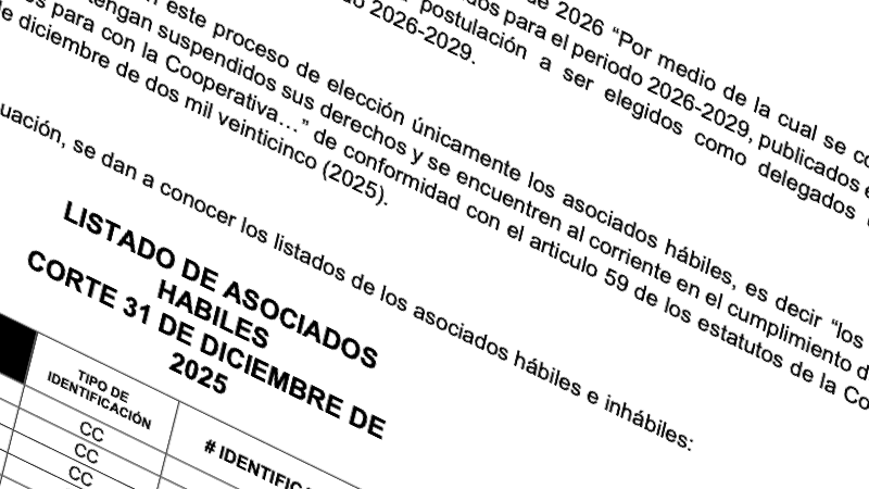 Listado de asociados hábiles, que podrán participar en el proceso de la elección de delegados de la COOPERATIVA DE AVALES Y COBERTURAS COOPAVALCO, para el periodo 2026-2029.