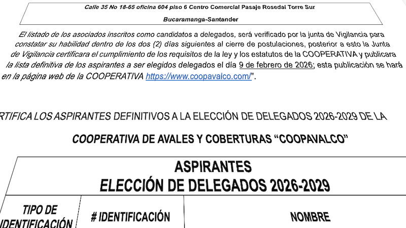 El Consejo de Administración de la COOPERATIVA DE AVALES Y COBERTURAS COOPAVALCO, en uso de sus facultades legales y estatutarias, reglamenta la elección de delegados para el periodo 2026-2029.