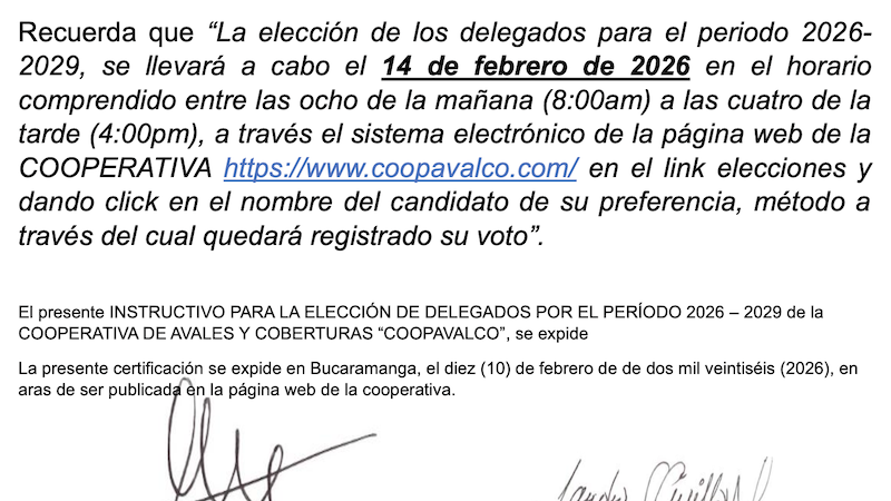 La elección de los delegados para el periodo 2026-2029, se llevará a cabo el 14 de febrero de 2026 en el horario comprendido entre las ocho de la mañana (8:00am) a las cuatro de la tarde (4:00pm), a través el sistema electrónico de la página web de la COOPERAT}IVA https://www.coopavalco.com/ en el link elecciones y dando click en el nombre del candidato de su preferencia, método a través del cual quedará registrado su voto.