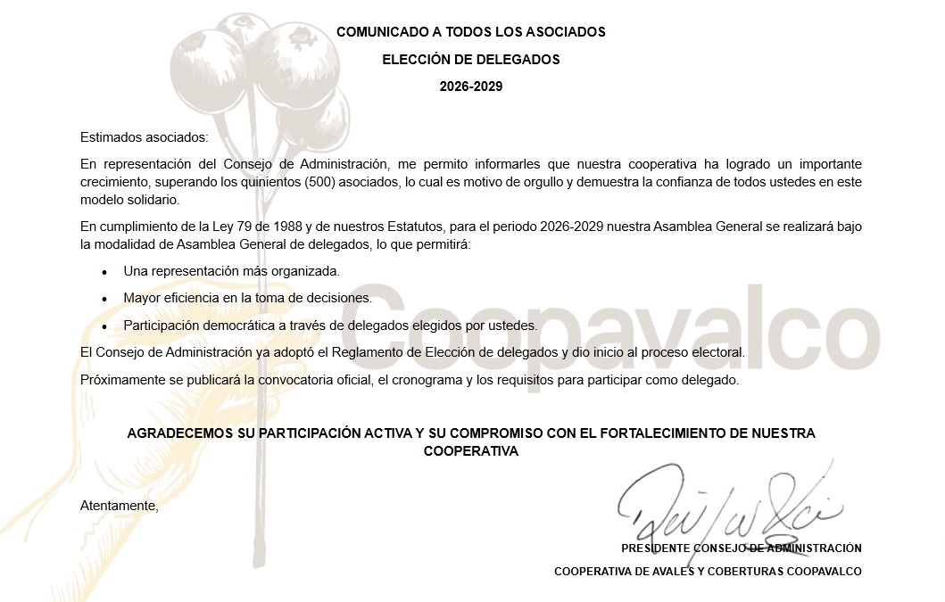 El Consejo de Administración de la COOPERATIVA DE AVALES Y COBERTURAS COOPAVALCO, en uso de sus facultades legales y estatutarias, reglamenta la elección de delegados para el periodo 2026-2029.
